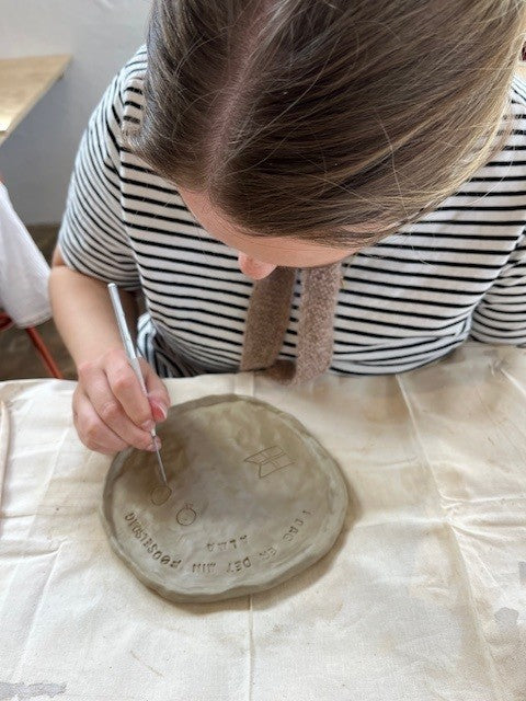 Du får 500 g stentøjsler og der er mindst 3 lertyper at vælge imellem, masser af bogstavstempler, begitning og glasur i mange fine farver, så du kan skabe en fin kreation. (Der kan også tilkøbes mere ler). Vi guider dig og tager gerne en baby på armen, mens du færdiggør dit projekt. Når du er færdig vælger du glasuren. Vi forgløder, glaserer og brænder og du kan hente dit færdige keramik efter 3-4 uger.